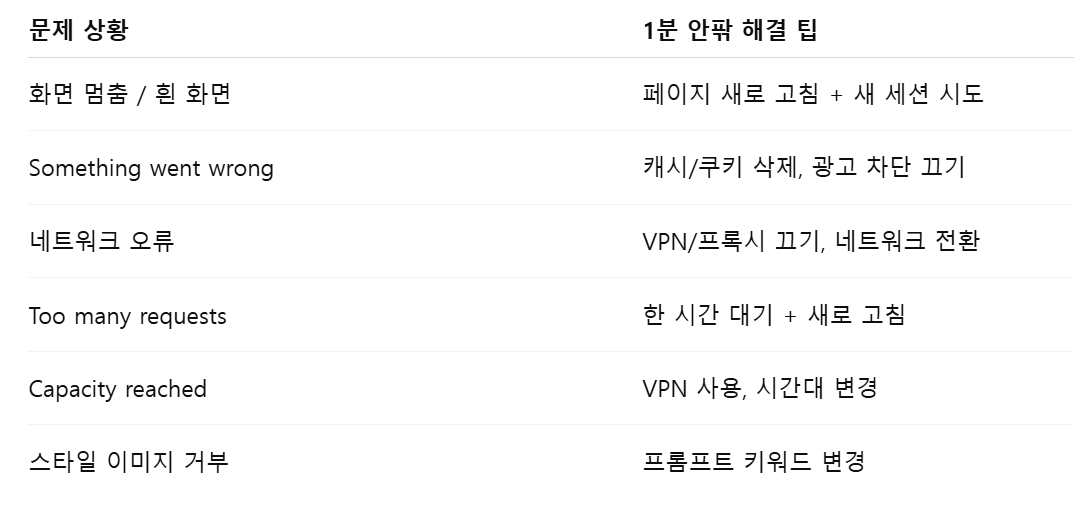 챗GPT 사용자라면 한 번쯤 경험했을 ‘Something went wrong’, ‘Too many requests’, ‘비전 이미지 생성 차단’ 등 다양한 오류 상황. 특히 지브리 스타일 이미지 생성이 안 될 때는 당황스럽기만 하죠. 본 글에서는 1분 만에 해결 가능한 핵심 팁을 단계별로 정리했습니다.