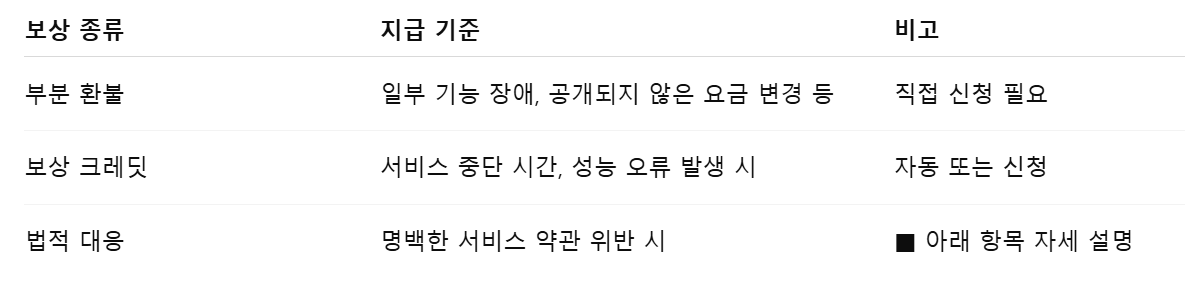 - 모델 응답 지연, 연결 끊김, 접속 실패 등이 일정 시간(예: 24시간 연속 장애) 발생하면, 시간 비례 환불 또는 크레딧 지급 대상.