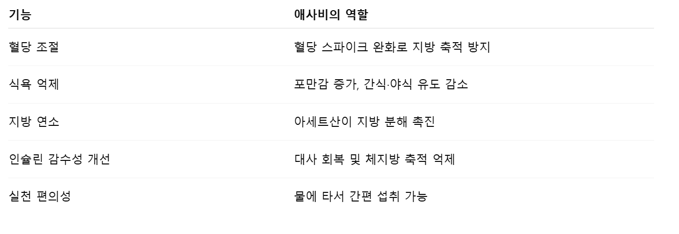 애사비는 단순한 건강 식초가 아닙니다. 다이어트에서 중요한 **‘혈당 조절’, ‘식욕 억제’, ‘지방 축적 방지’**를 동시에 도와주는 천연 보조제 역할을 합니다.