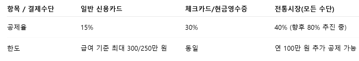 - 한도: 기본 카드 공제 한도 + 전통시장 등 항목별 추가 공제